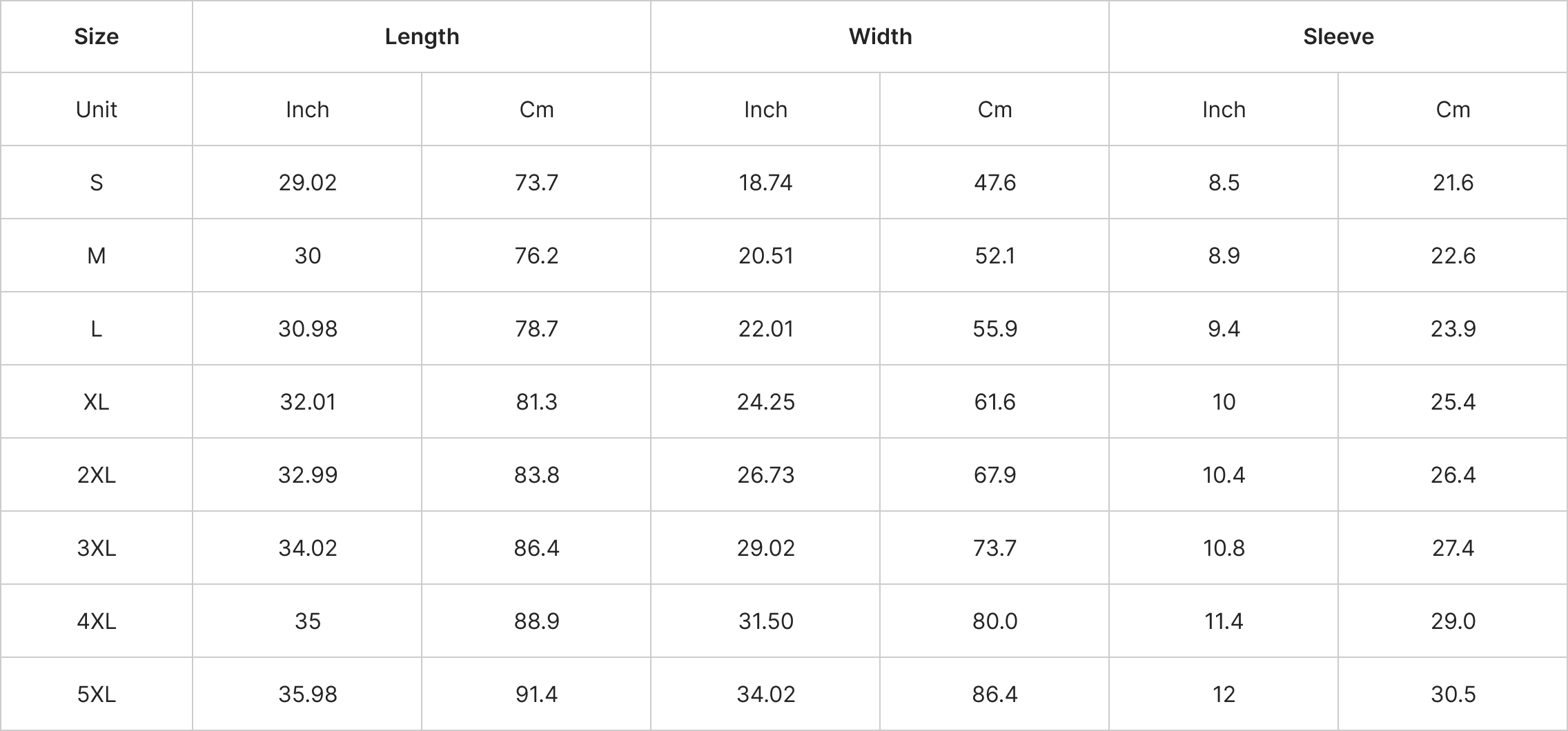 Talla: S, M, L, XL, 2XL, 3XL, 4XL, 5XL.